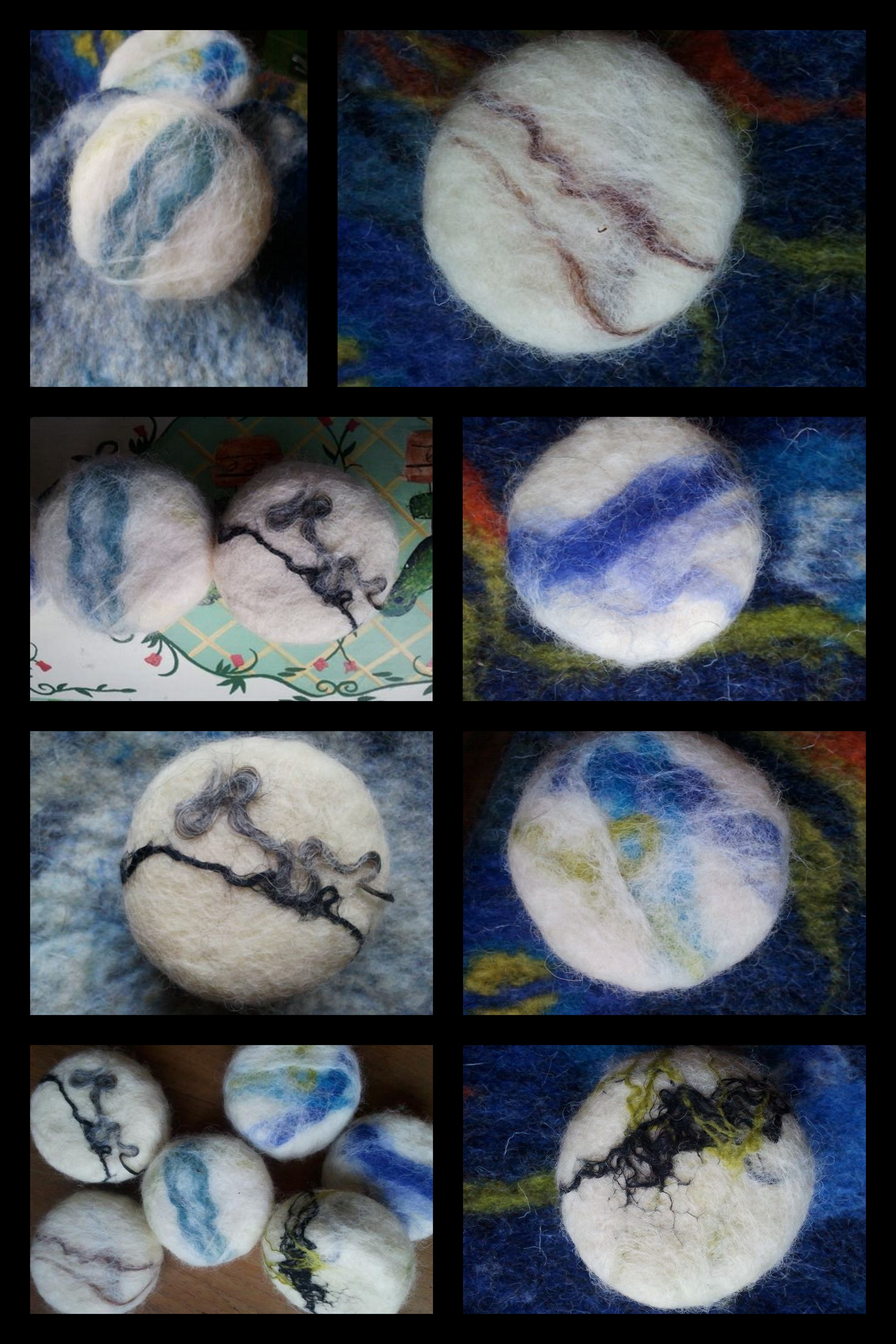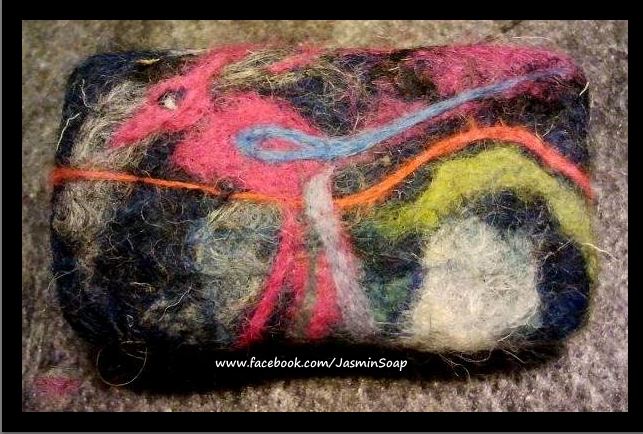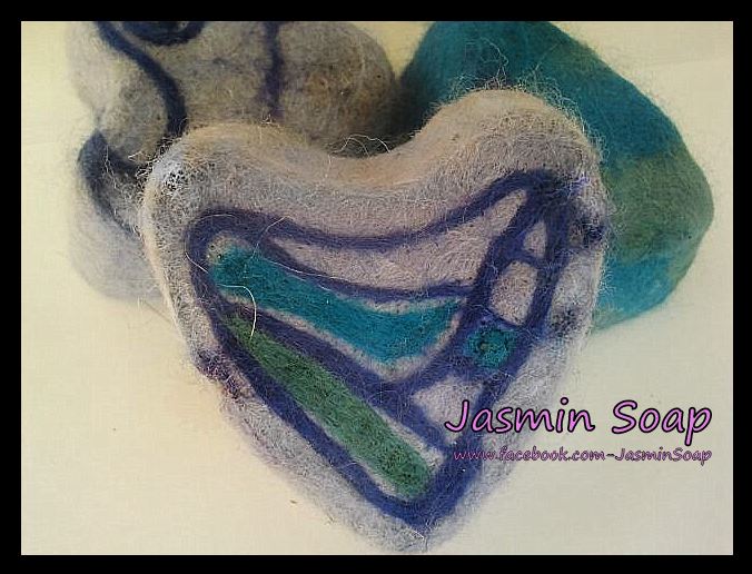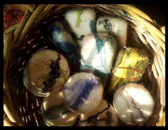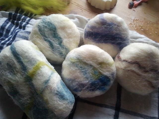 Dit zijn de zepen die ik in 2014 heb gemaakt. Het is mijn begin en kennismaking met vilten. Het is verslavend leuk. Ik gebruik een combinatie van natvilten en droogvilten. Met natvilten wrijf je de wol tot vilt met water en zeep en met droog vilten gebruik je een viltnaald om preciezer te kunnen werken.