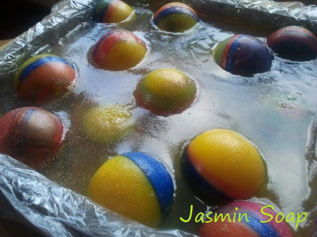 Toverballen maak je in een vrolijke bui. Dat is al heel belangrijk. Om een mooie ronde vorm te krijgen, heb je een speciale mal nodig. In dit geval was ik aangelopen tegen een samengestelde mal die voor lollies gebruikt wordt. Lollies interesseren me niet, maar zeep wel. De gietgaatjes knipte ik wat groter. Dat het wat lelijke en onregelmatige gaatjes werden, merk je straks niets meer van.