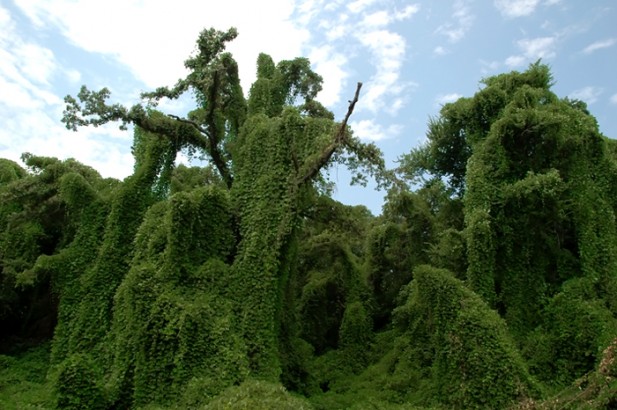 Kudzu is een ongelofelijk veelzijdige woekerplant. In de jaren 30 en 40 van de vorige eeuw werd hij in het zuiden van de Verenigde Staten geïntroduceerd om de erosie van de grond tegen te gaan. Daar zijn ze later wel een beetje op teruggekomen. De plant ontwikkelde zich als een ware plaag. want hij heeft een groeikracht van tientallen centimeters per dag. Hij wringt zich door asfalt, beton, muren, resistent tegen kou en ziektes, groeit op alle grondsoorten.. Tegelijkertijd is kudzu een uiterst bruikbare plant. Van de vezels kunnen kleding en papier worden gemaakt, of manden gevlochten. Het blad is te eten als spinazie., en bevat heel veel proteïnen. In Japan wordt de wortel van de kudzu verwerkt in diverse gerechten als gelerend bindmiddel. In de traditionele Chinese geneeskunde worden de wortel, de bloemen en het blad medicinaal gebruikt bij onder andere clusterhoofdpijn en migraine. Van de bloemen wordt ook thee gemaakt, of snoep. De honing van bijen die foerageren op kudzu gebieden, produceren een rode tot paarse honing die naar bubblegum smaakt.