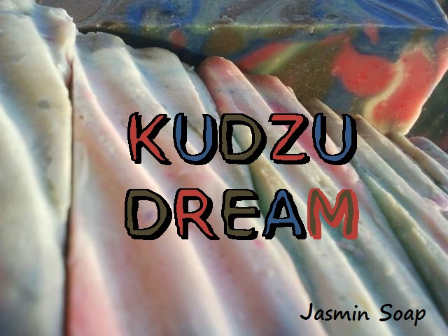 Kudzu Dream zeep is één van een reeks zepen van hetzelfde recept, maar met kleine onderlinge verschillen. Iedere keer verander ik geur, of kleur, of een techniek. Kleine veranderingen kunnen het karakter van een zeep sterk beïnvloeden. Voor de kleuren van de zeep ging ik uit van de Kudzu bloem, omdat ik ook die geur wilde gebruiken.