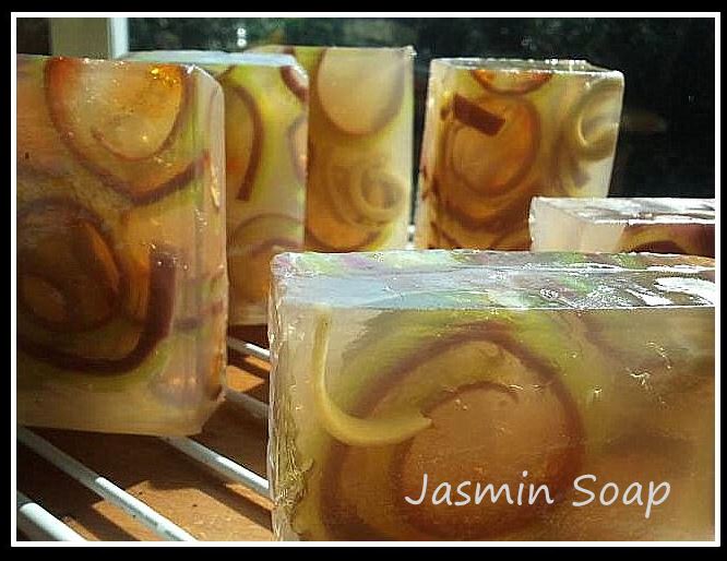Bij deze bruine Rooibosthee zeep zie je het effect als de transparante zeep letterlijk (grofweg) geroerd wordt met de basiszeep.
