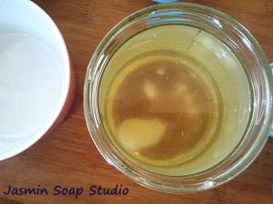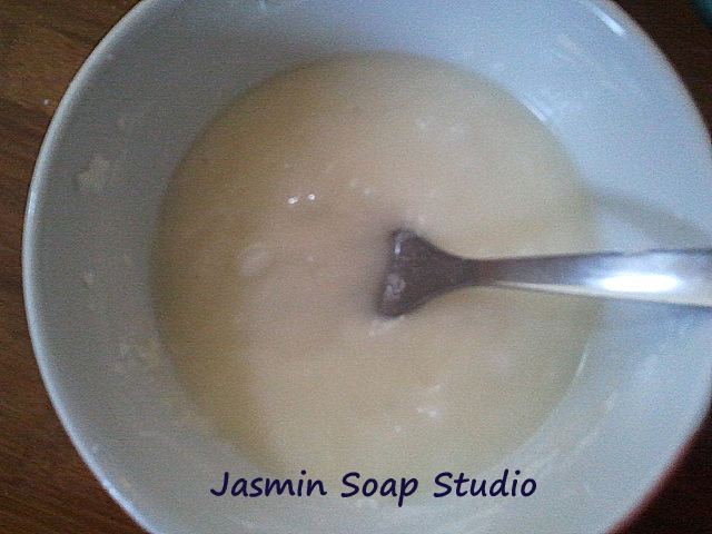 In het begin wil de glycerine niet mengen,en komt steeds bovendrijven. Bij kamertemperatuur blijft de cocosolie vrij lang vloeibaar. Je kan om het kwartier de massa weer doorroeren.