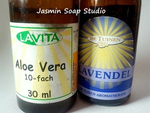 Vervolgens kan je er naar keuze een paar druppels etherische olie bij doen. In mijn geval deed ik 6 druppels Aloë Vera extract, en 6 druppels etherische Lavendelolie erbij. Het ruikt niet sterk, maar voor precies goed voor mij persoonlijk.