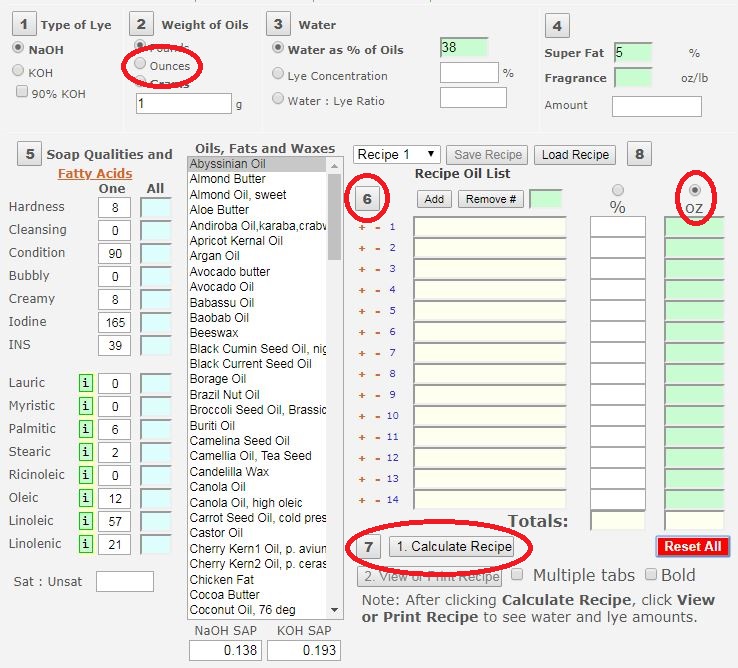 Ter oriëntatatie hebben we hier eerst een screenshot van een lege pagina op de Soapcalculator. Ik ga hem deze keer niet helemaal uitleggen (een goede reden om nog een keer een vervolgblogje te schrijven over het gebruiken van de Soapcalc, want daar heb ik wel vragen over gekregen), maar ik beperk me nu alleen tot het handig omzetten van een recept dat in ounces wordt weergegeven.