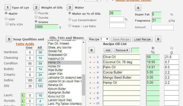 Nummer 1 berekenen we met de computer. Elke soort vet heeft een eigen verzepingswaarde. Dat houdt in de hoeveelheid NaOH dat er nodig voor is om dit vet tot zeep te maken of omgekeerd geredeneerd: de hoeveelheid loog die nodig is om het vet volledig te neutraliseren zonder dat er loog overblijft. Vroeger gebruikten we verzepingstabellen en een rekenmachine, maar tegenwoordig kunnen we online op de computer naar de gratis Soapcalculator.