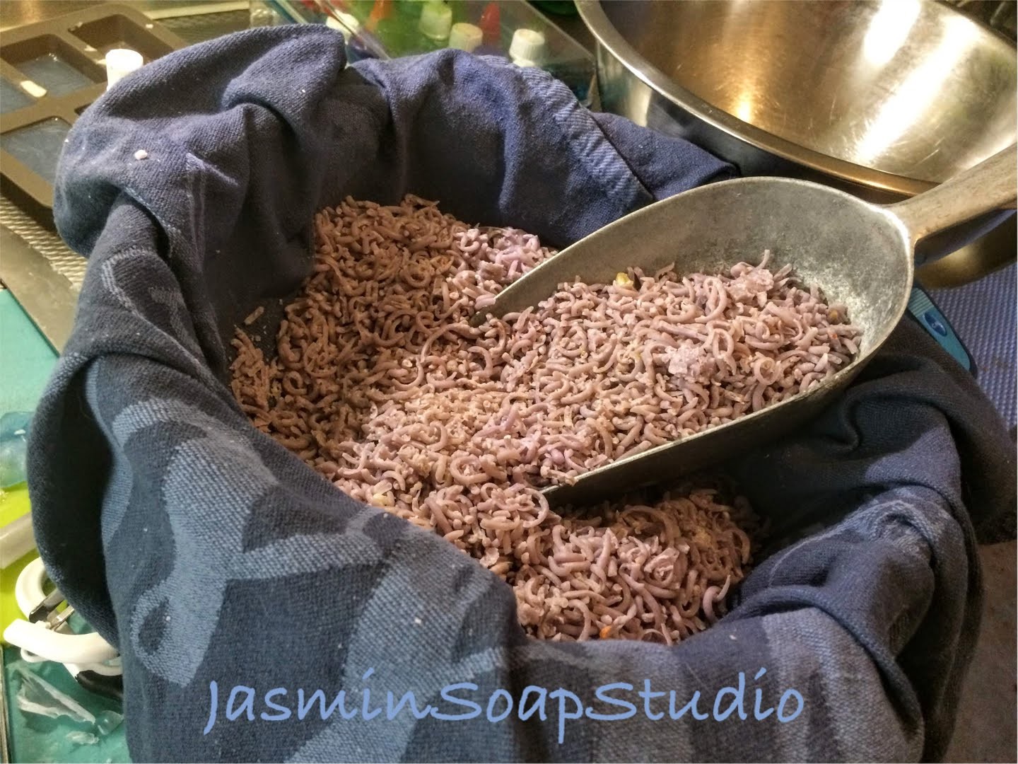 De hele zeep ging over een rasp en werd daarna twee maanden apart gezet om ondanks alles te drogen en te rijpen.