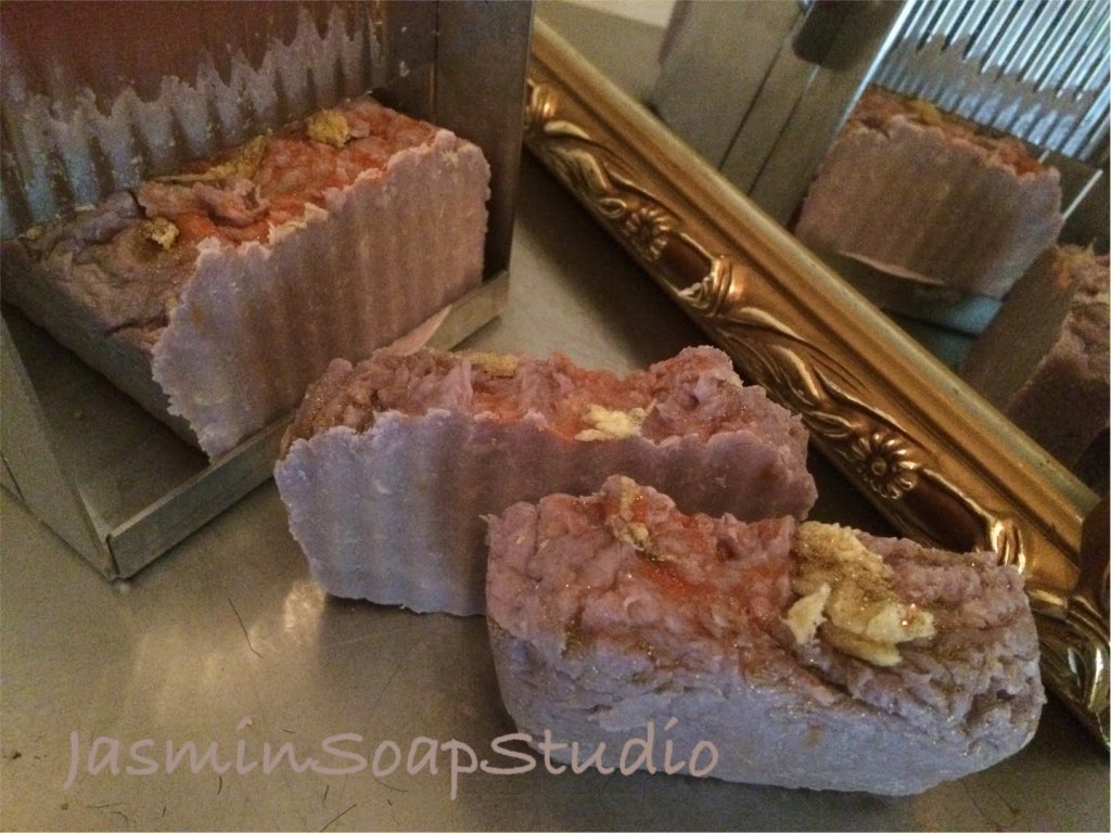 Ik besloot toen al dat de zeep in de rebatch zou gaan, terug naar de zeeppot op een later tijdstip. Eerst stortte ik de zeepmassa in een mal, deede er wat goudglitter bovenop en zette deze apart. Ik was wel benieuwd of alles nog goed zou komen.