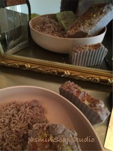 Het is best wel mogelijk om een leuk design te maken met hergebruikte (rebatch) zeep, maar daar had ik geen zin in. Ik wil eigenlijk een flinke hoeveelheid harde zepen hebben om in de wintermaanden te gaan vilten. Het uiterlijk van de zeep is dan niet zo belangrijk.