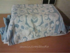 Daarna ging de zeep de gelfase in (bewust gedaan). Ik had de mal met zeep ingepakt met handdoeken en op een element van de centrale verwarming gezet. Het zal hooguit 20 graden zijn geweest, maar binnenin ging de temperatuur goed oplopen.