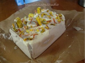 - na het storten in de mal, zet ik mijn zeep buiten op balkon, in de tuin (als het koud is buiten) of ik zet de zeep in de koelkast of diepvries