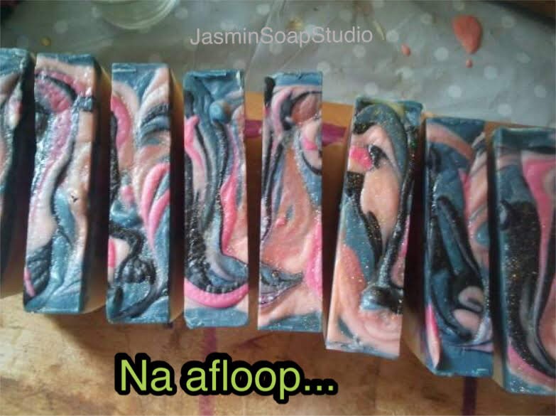We nemen de volgende foto als voorbeeld. Het was een feestje om deze zeep te maken. Alles ging perfect, de kleuren straalden en de holografische mica gaf een prachtige extra ‘sparkle’.
