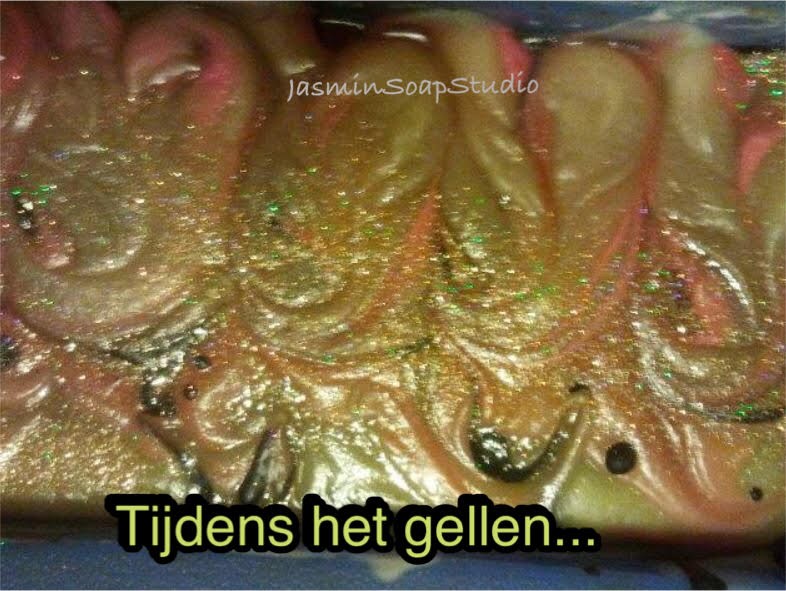 Op de volgende foto zie je hoe de gelfase eruit zag. De zeep werd donker van kleur en leek te neigen naar een soort transparantie. De zeep in zijn geheel onderging deze verandering. Na de gelfase verdwijnt de transparantie en trekken de kleuren weer bij. Toch zullen de kleuren blijvend sterker en donkerder zijn dan voorheen. Je ziet óók dat het reliëf van de toplaag als een plumpudding inelkaar zakte en zich niet meer herstelde.