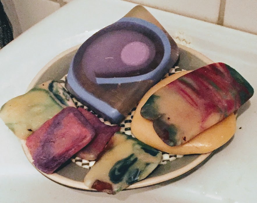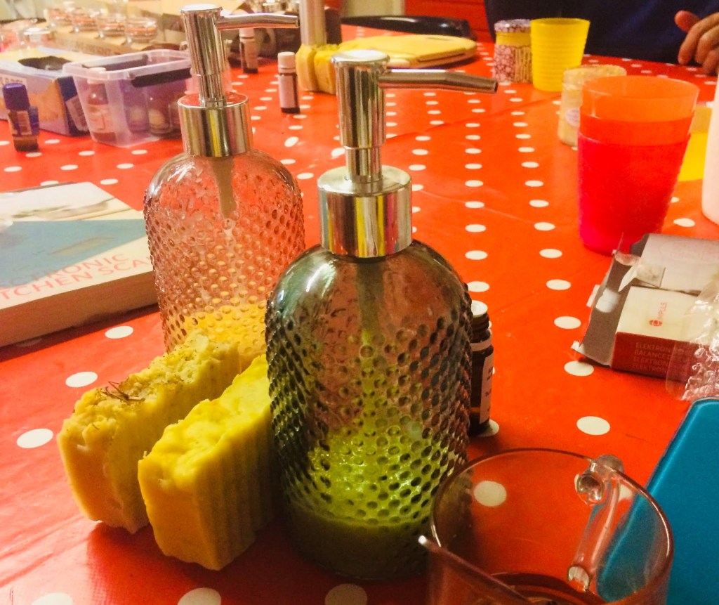Met een vette grijns keek ik naar mijn voorraad handgemaakte zepen aan het begin van de Coronacrisis. Aan zeep geen gebrek en héél veel handen wassen per dag blijft een feestje voor mij persoonlijk. Er liggen hier verschillende zeepschaaltjes bij de kranen met daarin bonte verzamelingen van kleur- en geurlijke zepen.