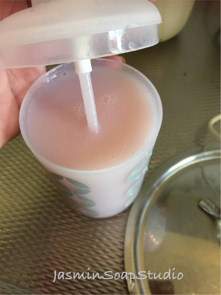 De roze vloeibare zeep bleef erg lang vloeibaar, dus die goot ik uiteindelijk zo in een handpompje. Ik wilde de afwas gaan doen en had geen zin in traag afwachten. De volgende dag was de zeep helemaal opgestijfd. Dit geeft helemaal geen probleem bij het gebruiken van het pompje, dus de staafmixer blijkt dus eigenlijk overbodig.