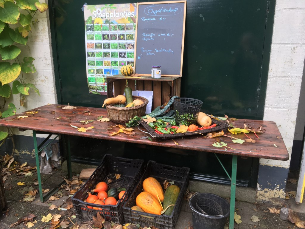 De herfst zet nog niet helemaal overtuigend in, maar het is wel duidelijk dat het zomerseizoen voorbij is. Bij Stadstuin de Klopvaart liggen de pompoenen te koop op een tafel naast de ingang van het knusse huisje.