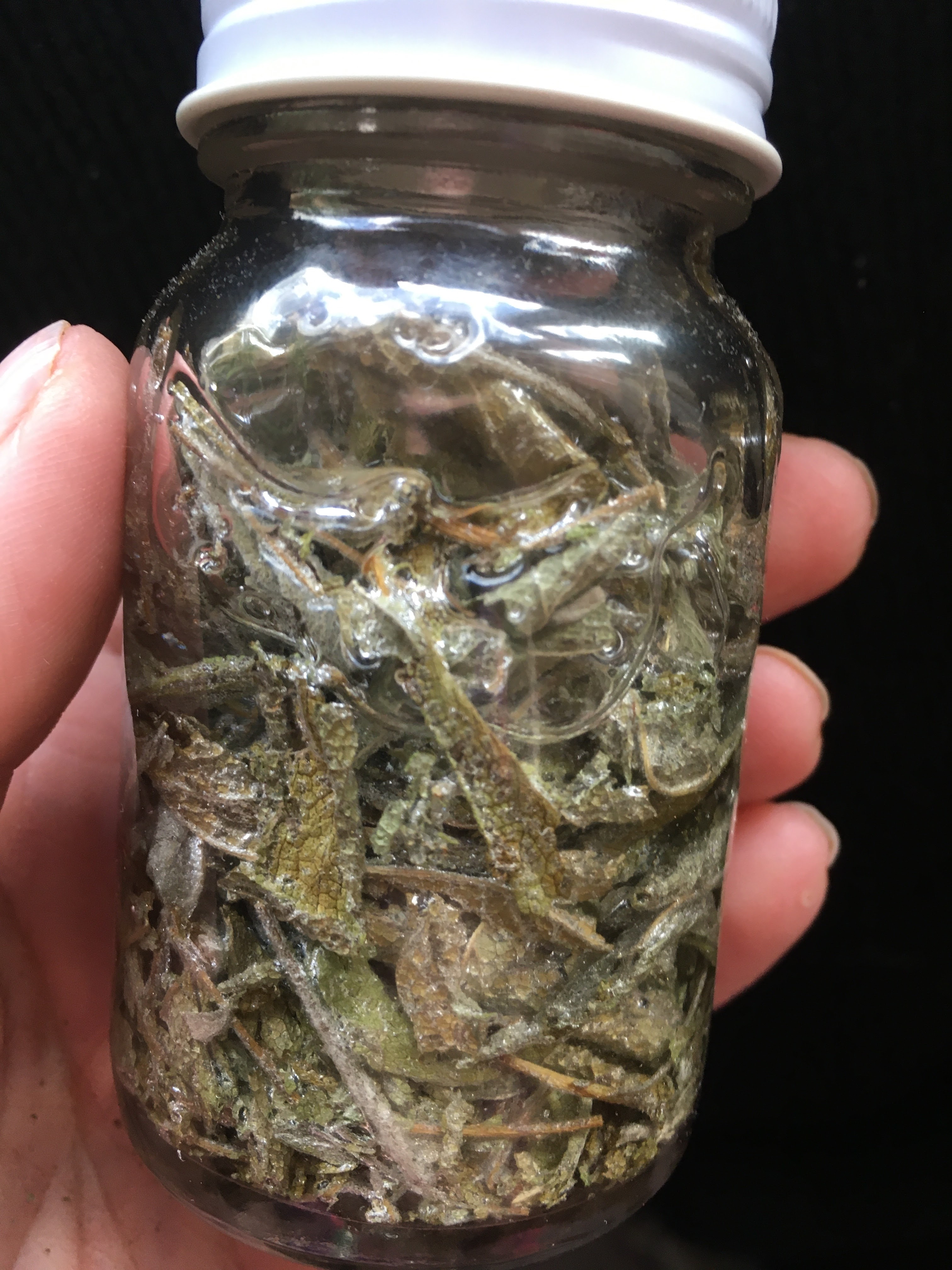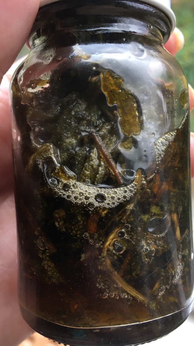 Net als met een olie maceraat kan je de glazen pot voorzichtig au-bain-marie verwarmen. Dit kan in een slowcooker met een laagje water, of elk ander pannetje. Nooit laten koken, nooit warmer dan 60 graden Celsius laten worden. Boven die temperatuur gaan de werkstoffen verloren die in het plantaardige materiaal zitten.
