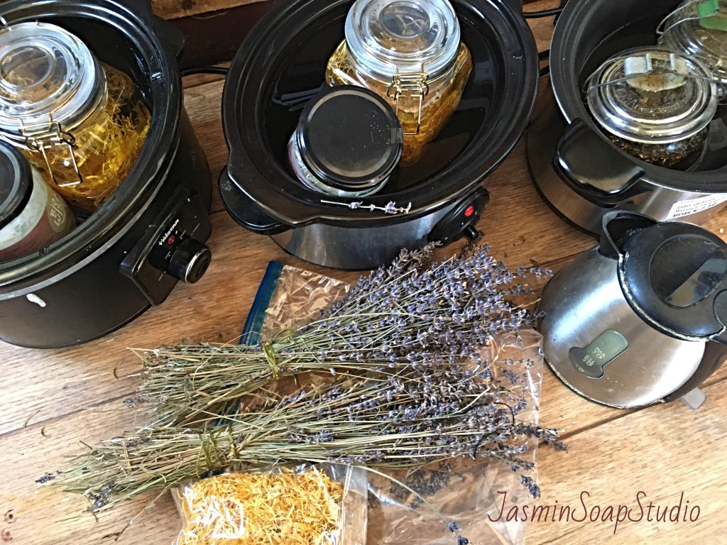 Een aantal weken vóór aanvang van de workshops was de gedroogde lavendel uit de moestuin al op biologische olijfolie en biologische kokosolie gezet. Dit heet maceraat maken. De goede werkstoffen komen dan in de olie terecht. De oliën worden een aantal keren verwarmd tot 60 graden Celsius gedurende meerdere dagen of weken.