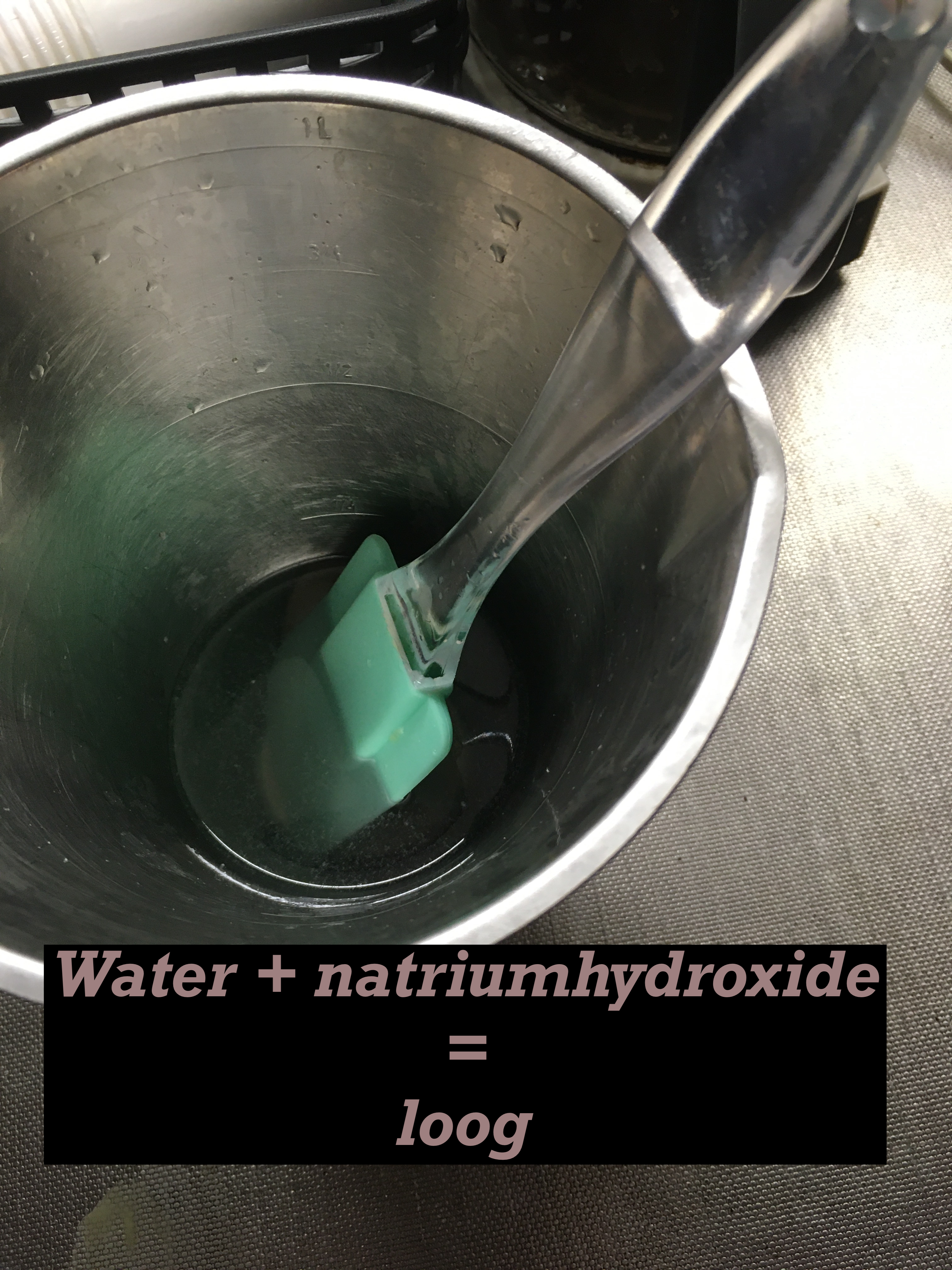 Daarna werden de vetten gewogen. De lavendelolie werd gezeefd, zodat de bloemetjes niet in de zeep zouden komen. We werkten met een basisrecept van olijfolie, palmolie en kokosolie. Dit geeft een stabiele zeep. Vanwege de vervelende dampen die vrijkomen bij het loog maken, deden we dit aan een tafeltje in de buitenlucht. Zodra de dampen waren verdwenen en de gemaakte loog helder van kleur was geworden, kon deze weer naar binnen gebracht worden.