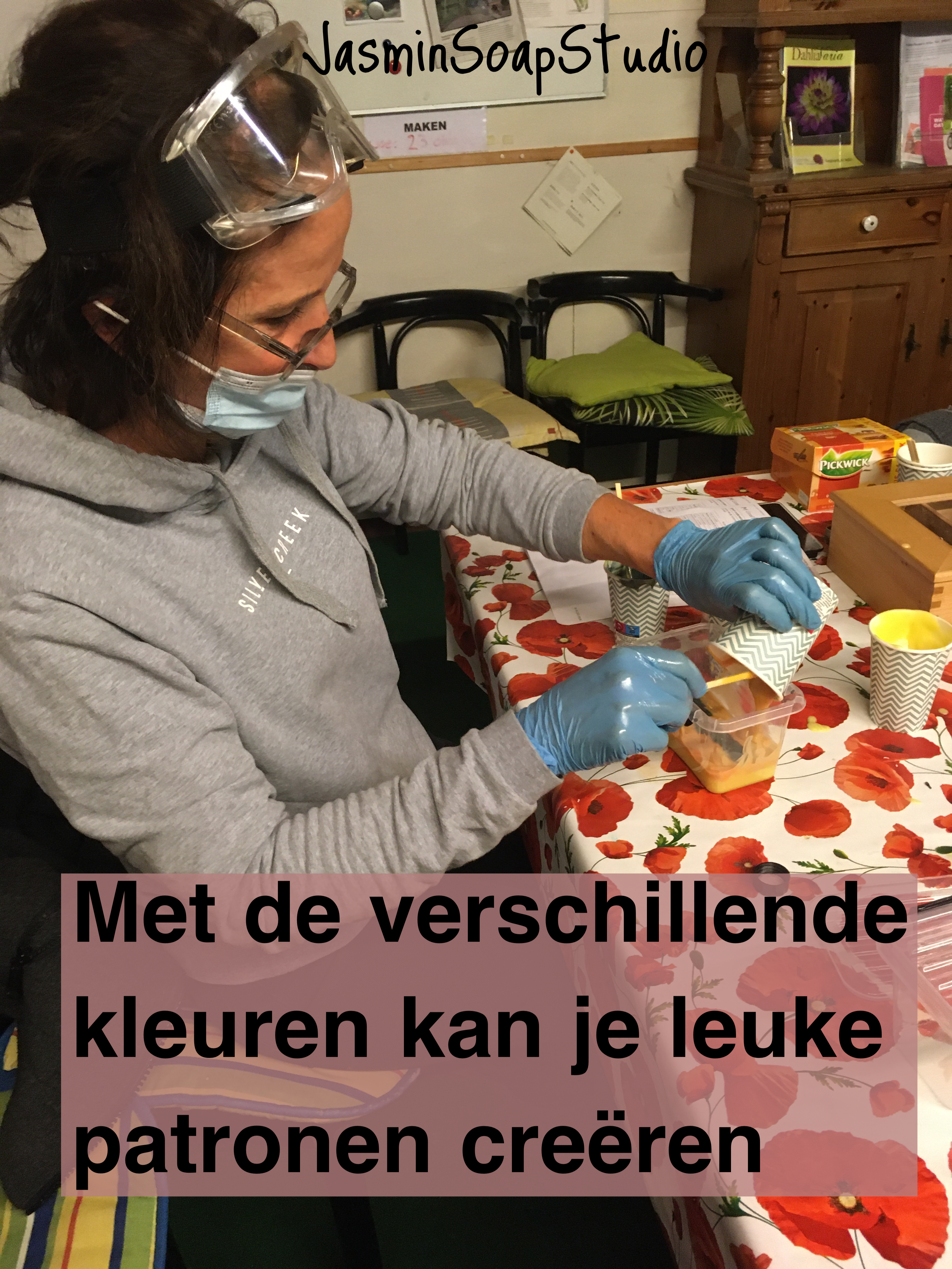 Voor leuke effecten kan je de vloeibare, rauwe zeep verdelen over een aantal bakjes. Daar roer je een lepeltje mica doorheen, of meerdere lepeltjes, afhankelijk van wat je wilt. Er zijn geen regels over hoe je verder gaat. De deelnemers van de workshop deden zeer uiteenlopende dingen. De één wilde een gewone egale paarse zeep, zonder toevoegingen. De ander deed laagje voor laagje, maakte geheime verassingen in de zeep die pas later zichtbaar zouden worden. Weer iemand anders werkte heel nauwkeurig met druppeltje-voor-druppeltje, om een confetti-effect te creëren.