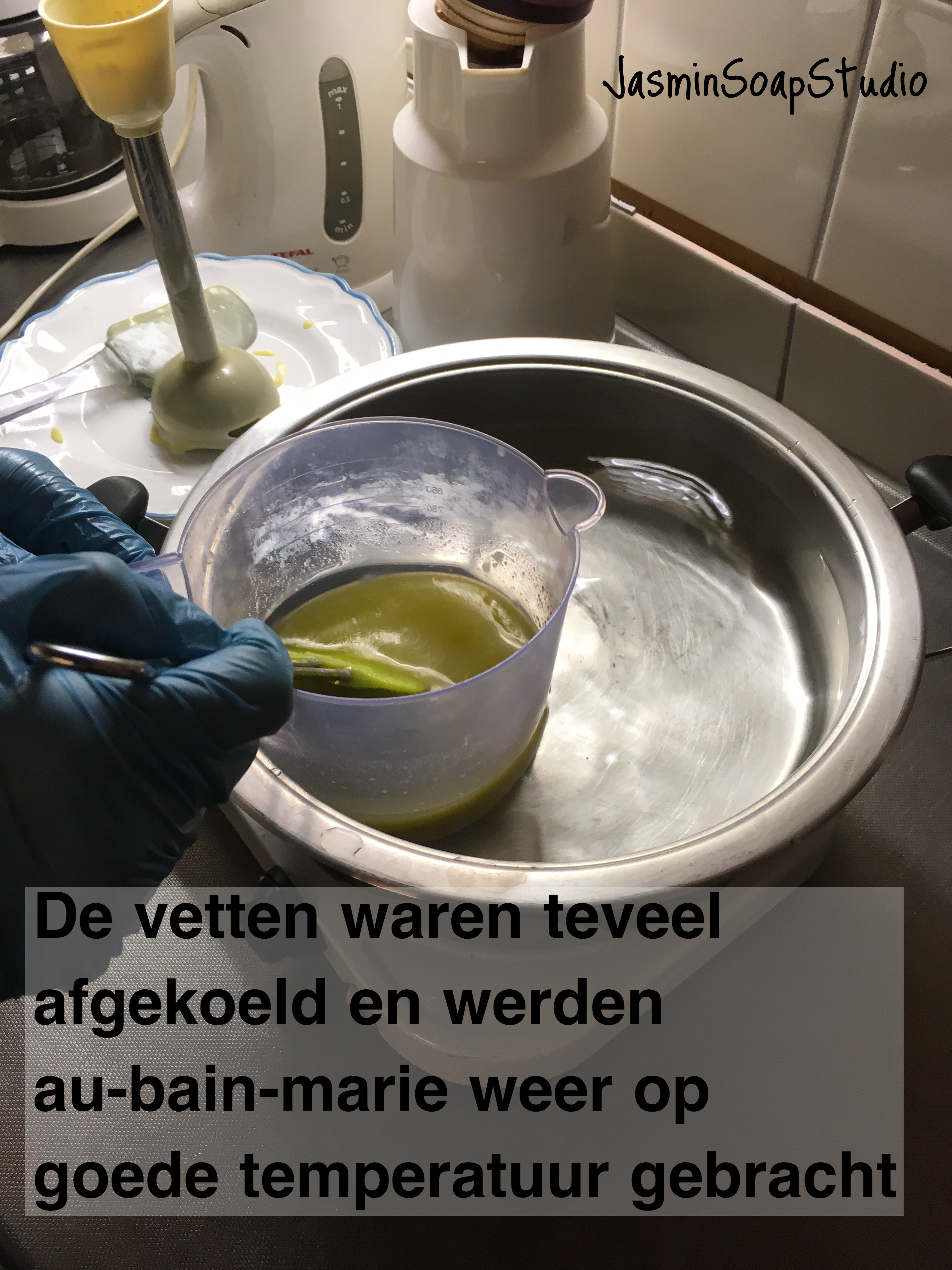 Het toevoegen en mixen van de loog en de vetten deden we één voor één om het per persoon goede aandacht te geven. Zo gebeurde het dat de vetten van de laatste personen teveel waren afgekoeld voor de mix, en toen werden die even snel weer extra au-bain-marie bijgewarmd. Zie de foto hierboven.