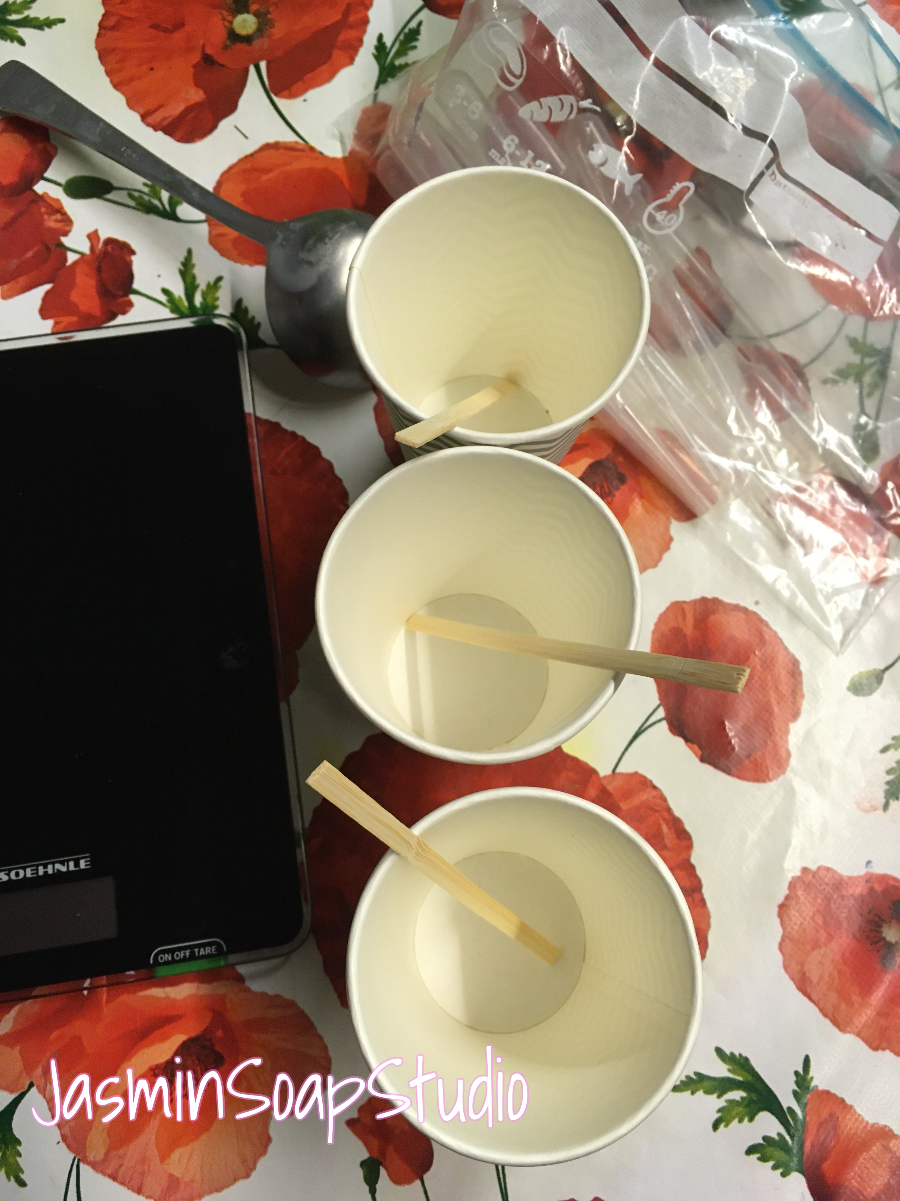 Na een inleiding over zeep en zeep maken, begonnen we met het echte werk. De gietvorm voor een pondje zeep werd ingewreven met minerale babyolie. Dit zorgt ervoor dat de zeep niet aan de vorm blijft plakken, want minerale olie verzeept niet en gaat geen reactie aan met de rauwe zeep die er zostraks in gaat. Er werden drie bekertjes per persoon klaargezet om een verdeling in kleuren te gaan maken.