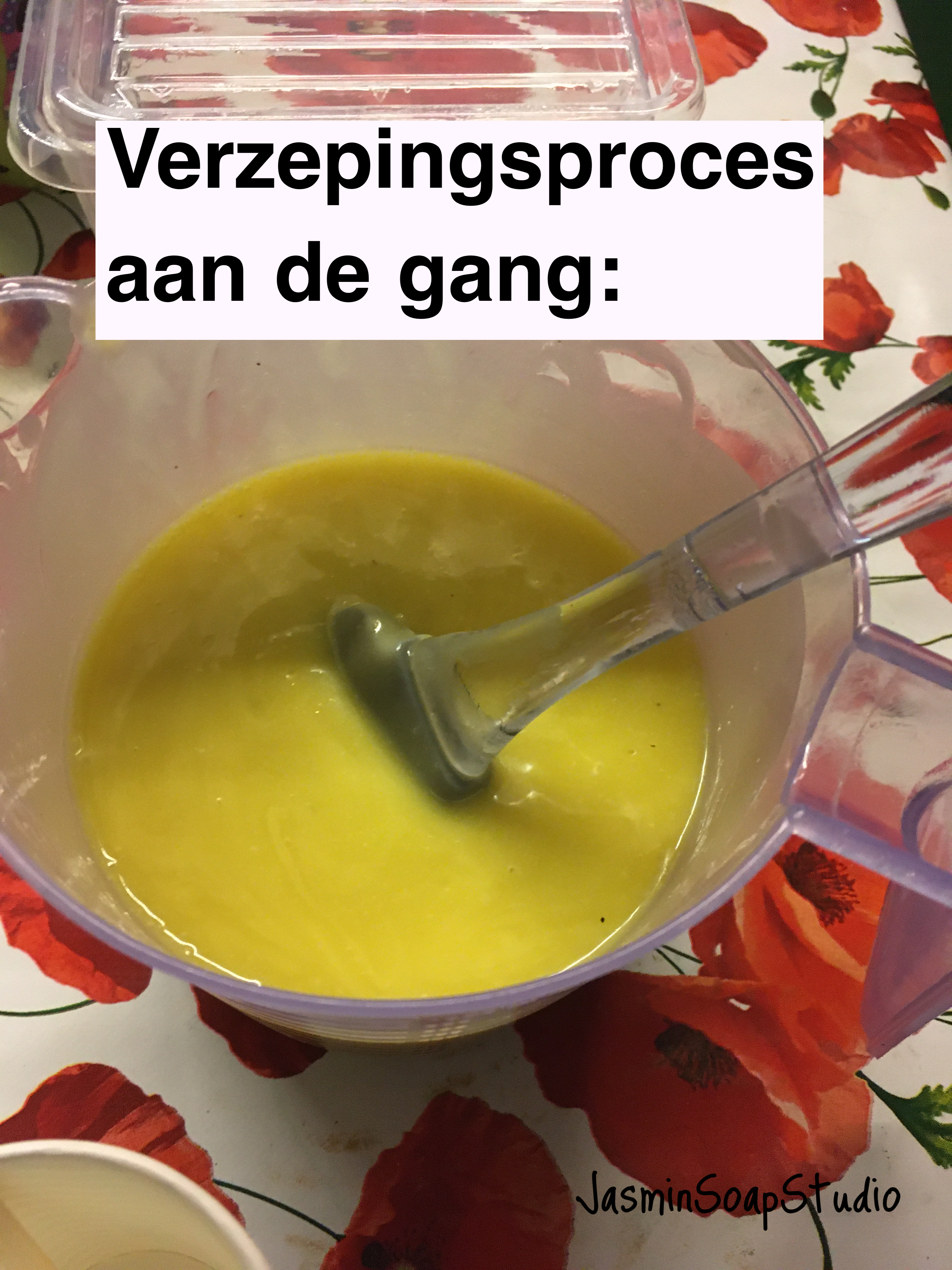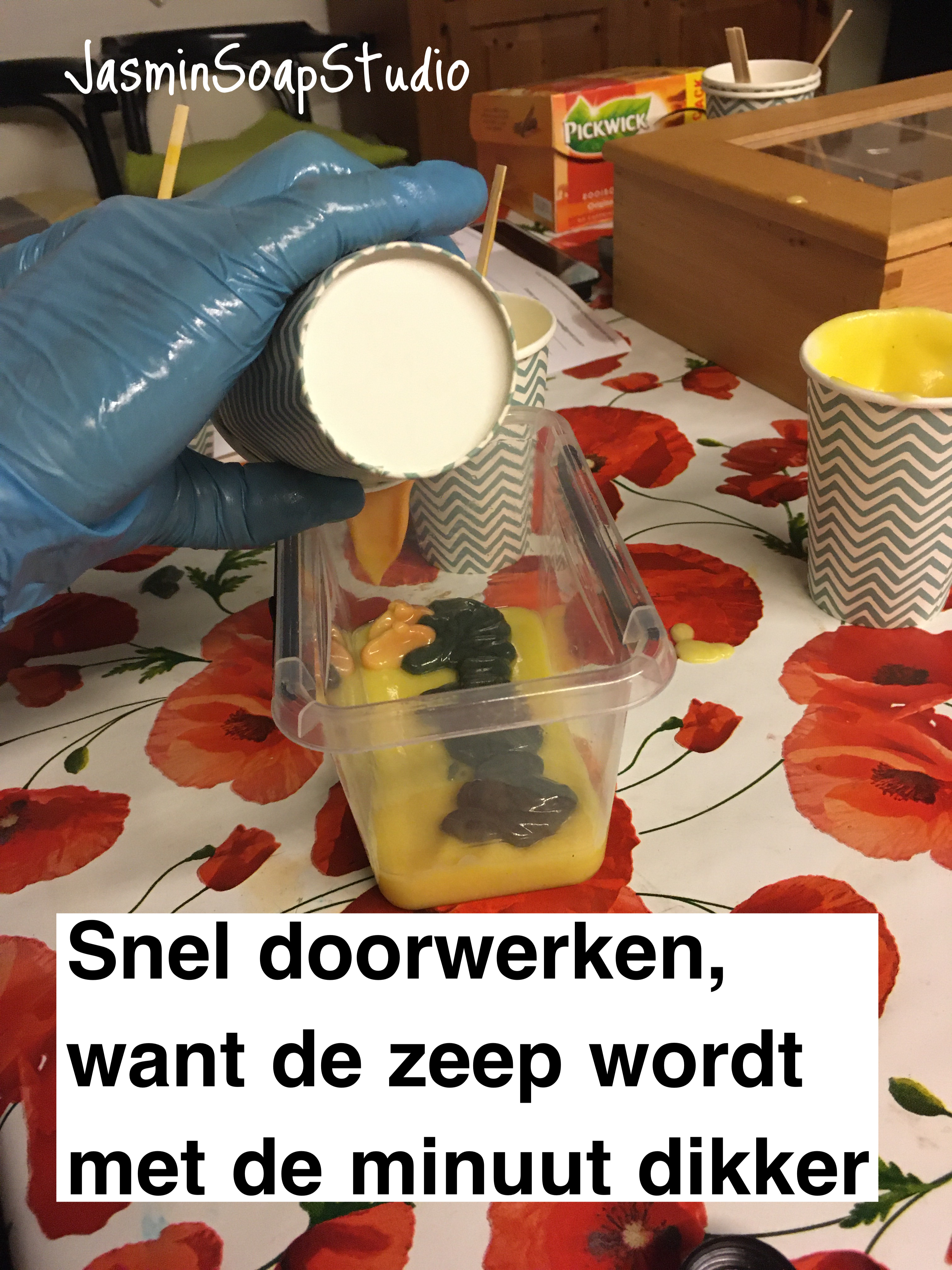 Heel voorzichtig blijf je roeren met je spatel en mixen met de staafmixer tot de massa gaat binden en je de consistentie van vla bereikt. De verzeping is dan in volle gang en gaat nog uren tot een dag door. Je kunt wel nu je geurstof en je mica’s gaan toevoegen.