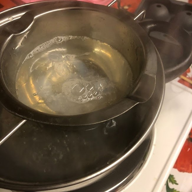 - au-bain-marie pannen of inzetstuk (van chocoladesmelten, verkrijgbaar bij IKEA of Blokker) boven pan kokend water boven kokend water met blokjes zeep erin die gaan smelten