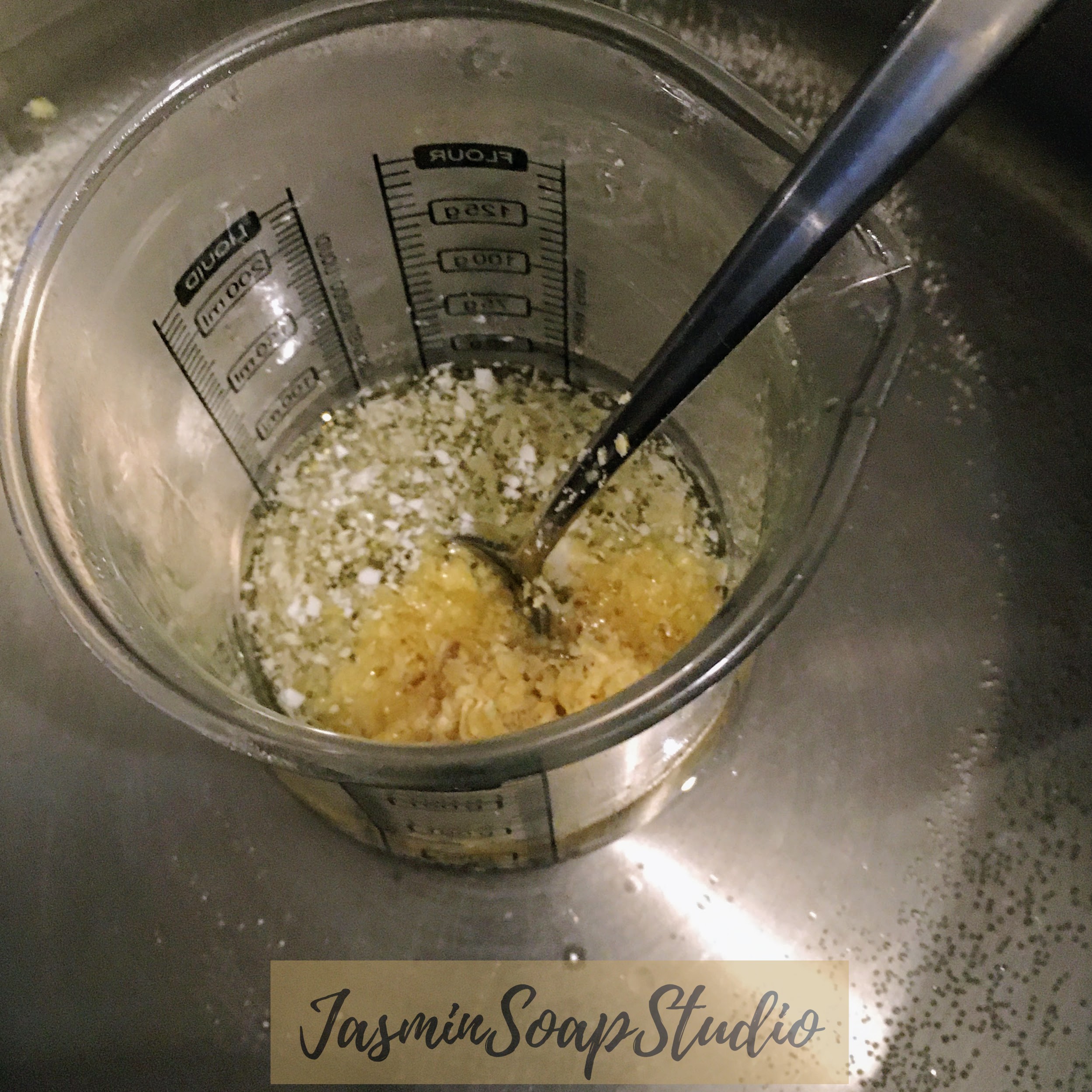 - Weeg 60 gram olie af in de hittebestendige glazen beker en zet deze in het water. Je kookplaat natuurlijk aanzetten.