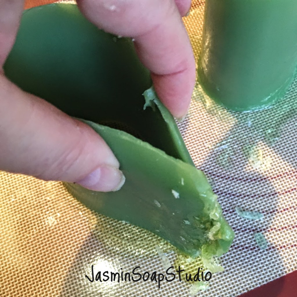 De grote lap zeep is afgekoeld en hard, maar nog wel warm. Snel handelen is geboden. In twee stukken snijden. Met twee handen een vorm kneden. Ik vind een paisley vaak leuk. Als de zeep te koud en te taai wordt, probeer dan met een warme föhn het oppervlak van de zeep zo te verwarmen, dan je soepel kan buigen.