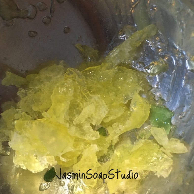 Ondertussen transparante zeep gesmolten. Vijf druppels geel en 1 druppel blauw.
