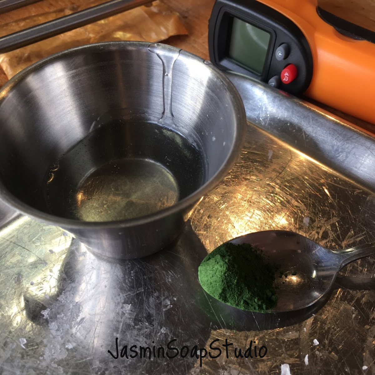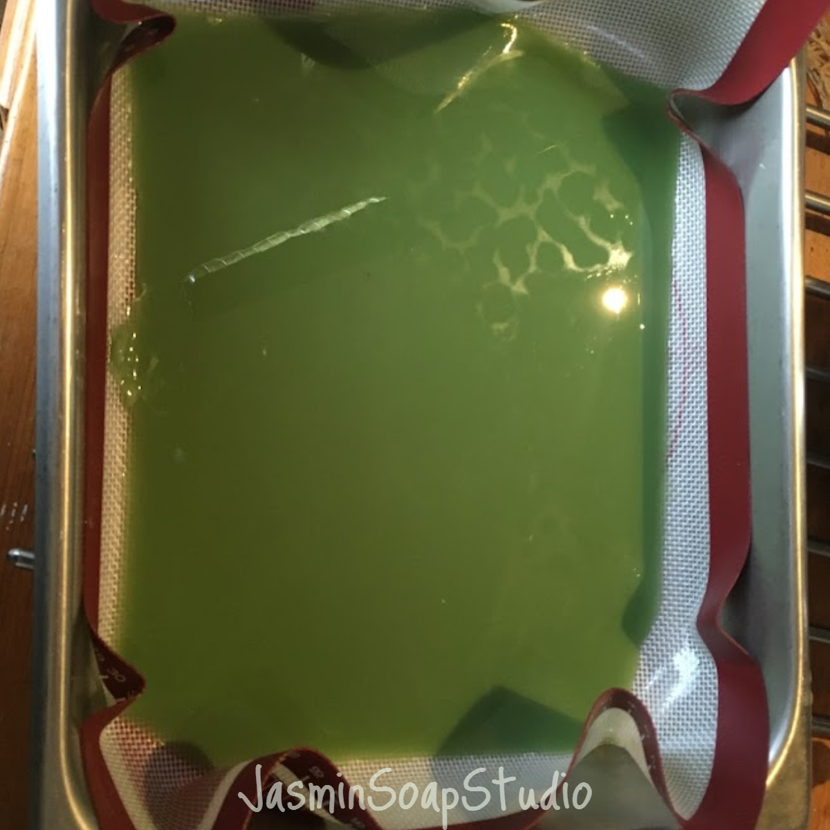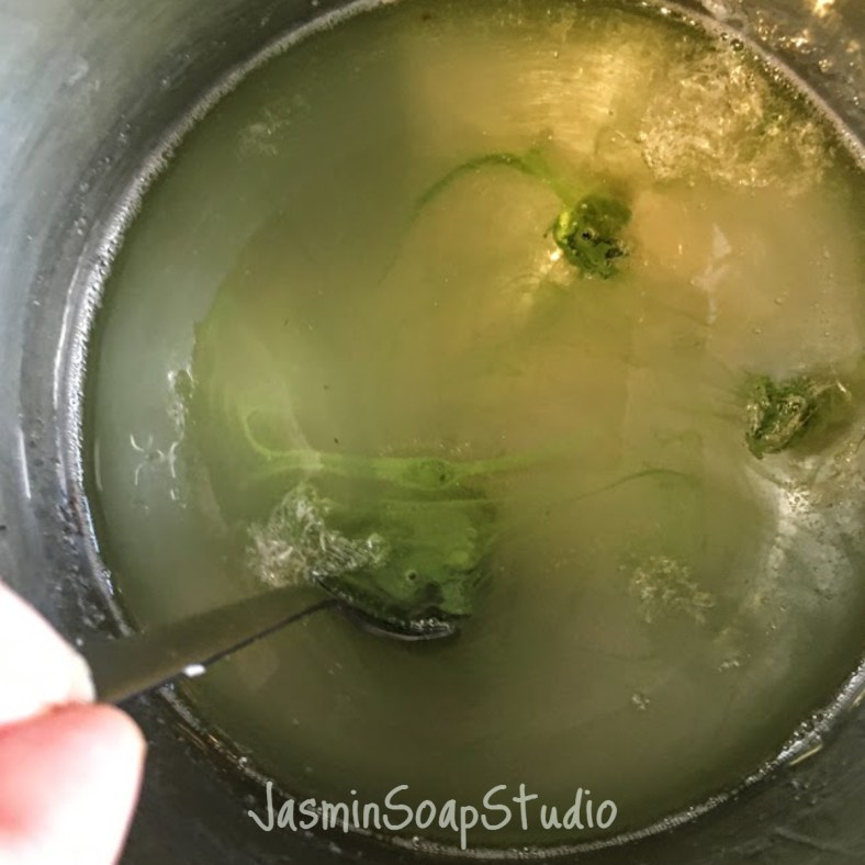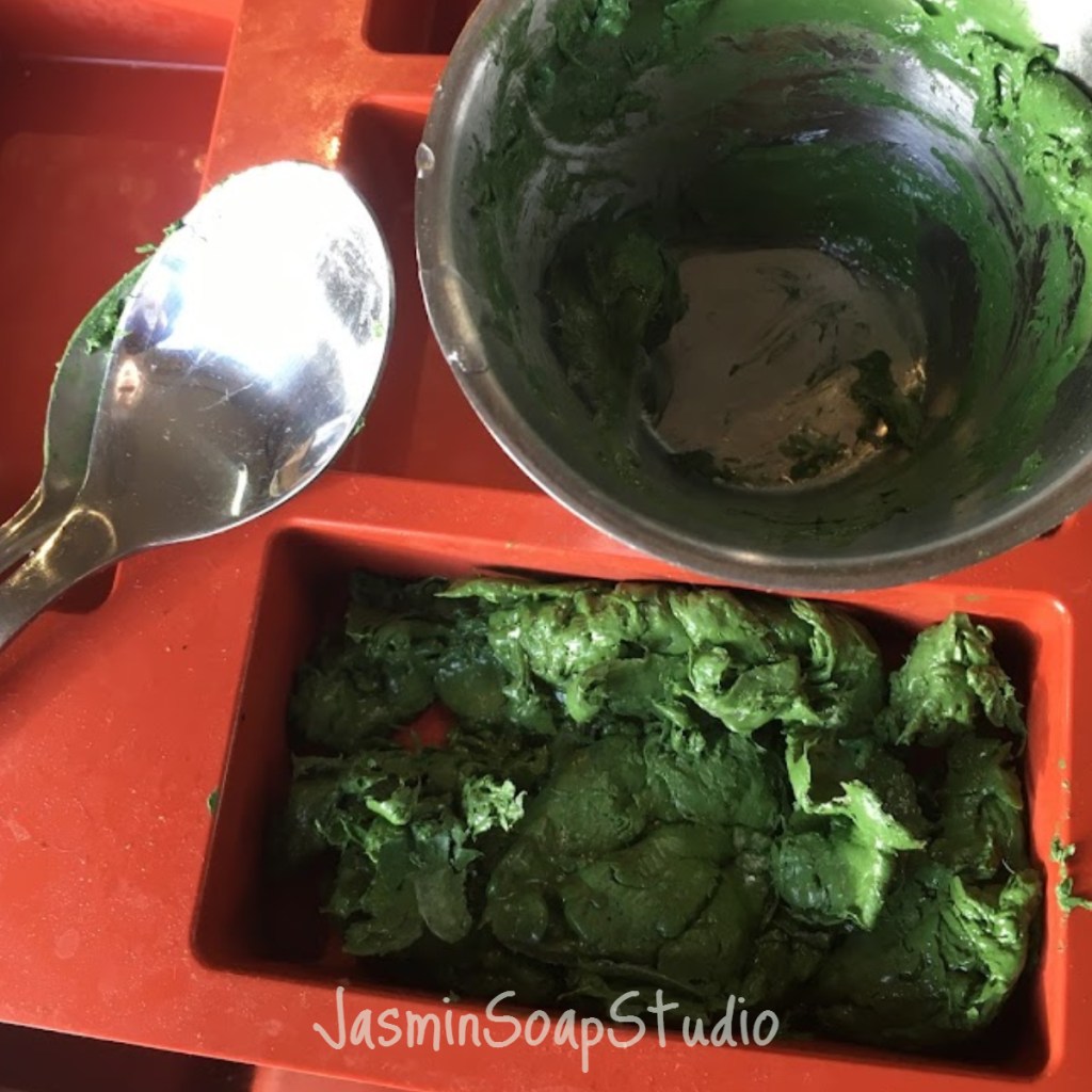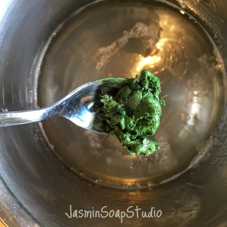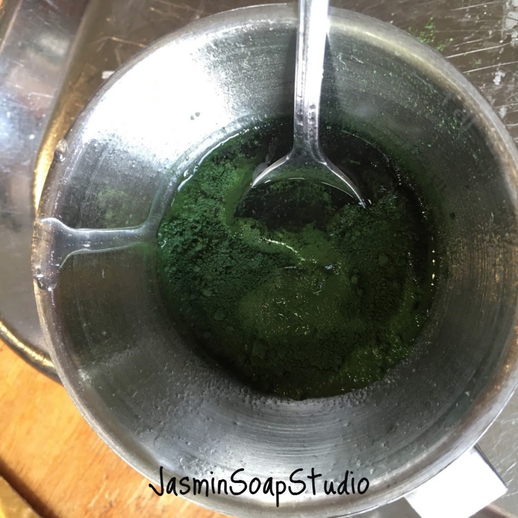 Neem wat warme zeep apart in een bakje en doe daar een half theelepeltje groene pigment bij. Om beter te laten mengen, leg je je hand over het bakje en tussen je vingers door spuit je de pigment (dat op het oppervlak van de zeep ligt) nat met een spuitflesje alcohol. . De natte pigment laat zich makkelijker mengen dan droge pigment. Vergeet niet tijdens het spuiten de zeep af te dekken met je hand, want anders stuift het poeder alle kanten op.