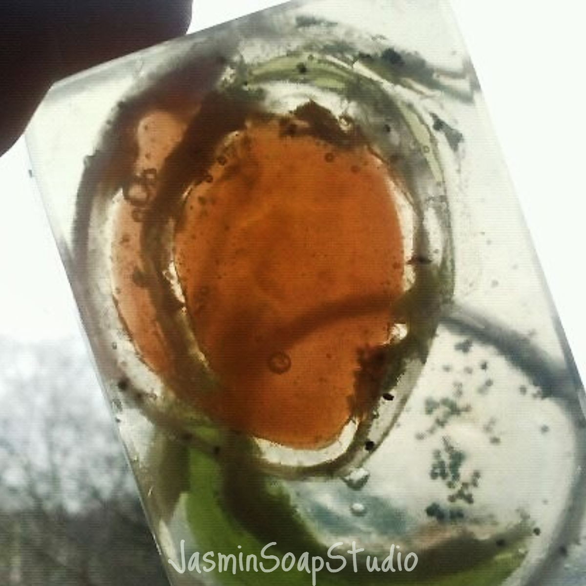 Dik transparant vlies gebruikt als mal en opgevuld met niet-transparante zeep, daarna in plakjes gesneden en in nieuwe zeep verwerkt