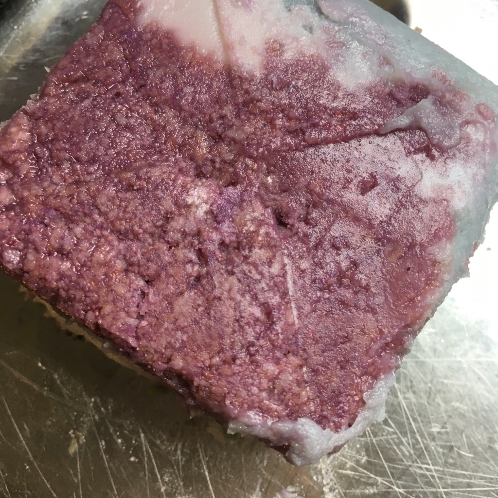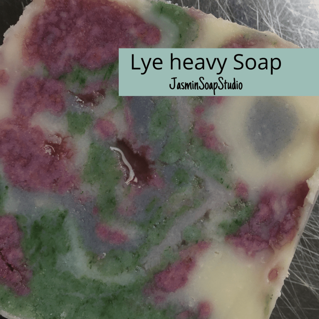 Als bonus nog een andere ‘mislukking’. De pigment-mix die ik in glycerine had opgelost veroorzaakte een blopperig effect. Er zit ook een beetje ‘ricing’ tussen (soort graankorreltjes), dus ook nog de invloed van de te hoge loogconcentratie, maar volkomen anders dan de blauwige kleur (die overigens lila had moeten zijn, haha). Deze glycerine-kleurstof zal nog prima te gebruiken zijn in Melt&Pour zeep.