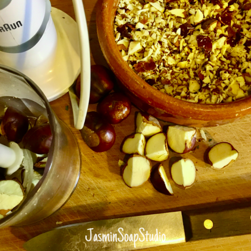 Ooit heb ik een video gezien van James Wong die een soort gel of zalf maakte van paardenkastanjes tegen spataderen. Ieder jaar neem ik me voor hier eens mee aan de slag te gaan, maar het is er nooit van gekomen. Soms wist ik geen kastanjes te vinden, soms had ik een zak geraapt en vergeten in de gangkast laten liggen. Als je dan eindelijk iets met de kastanjes wilt doen, blijken ze helemaal beschimmeld te zijn.