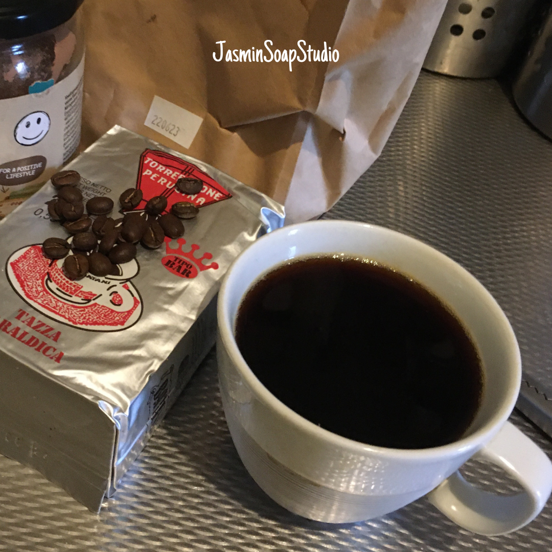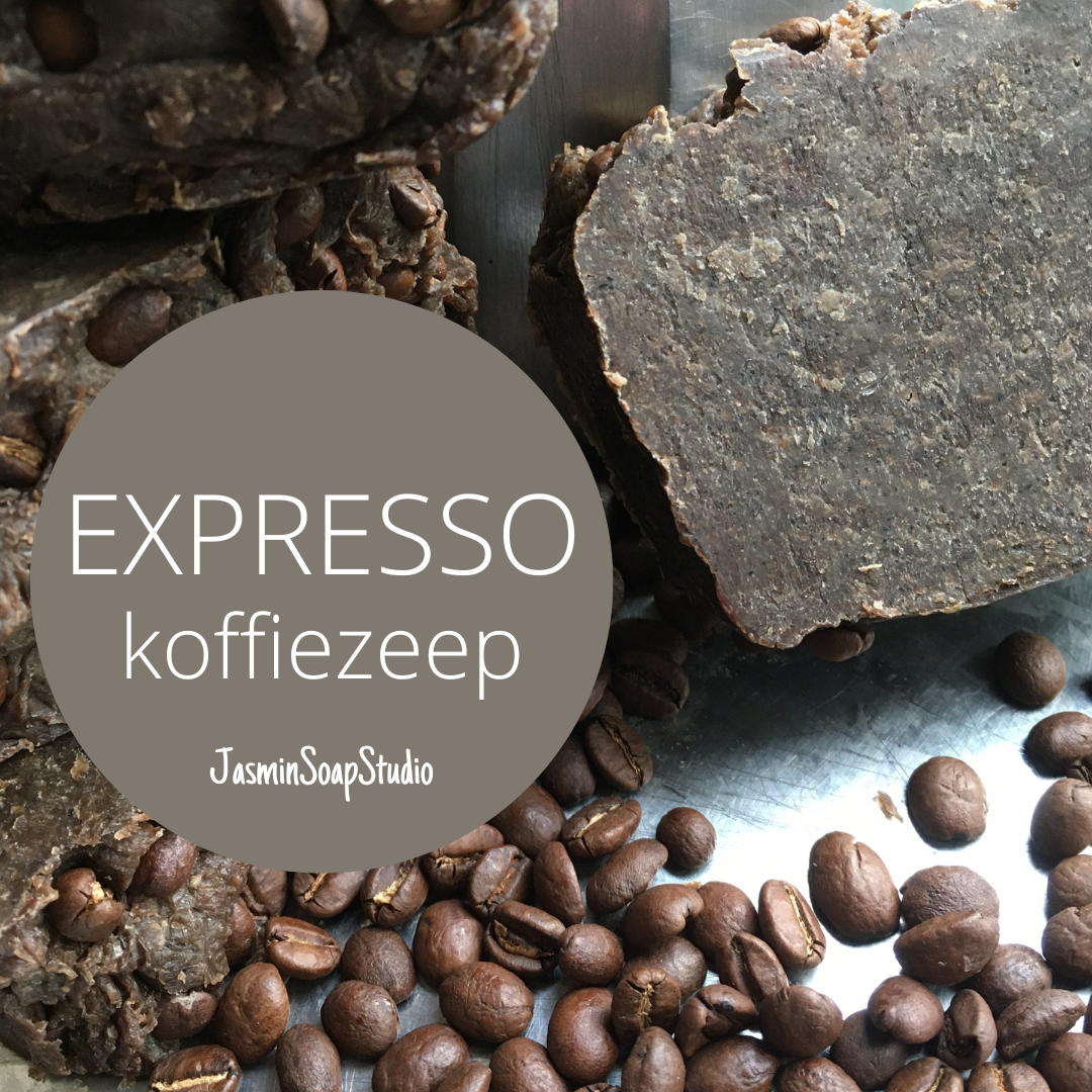 Ik bleef maar koffiedik kijken, steeds maar uitgesteld om een koffiezeep te maken. Hij is er nou en ik ben er superblij mee. Hij ruikt geweldig lekker en bevat ook heerlijke vetten. Plus heel veel koffie. In plaats van water gebruikte ik sterke expresso, door de zeep zit echte expresso koffie en de geurolie is ook “Expresso’.