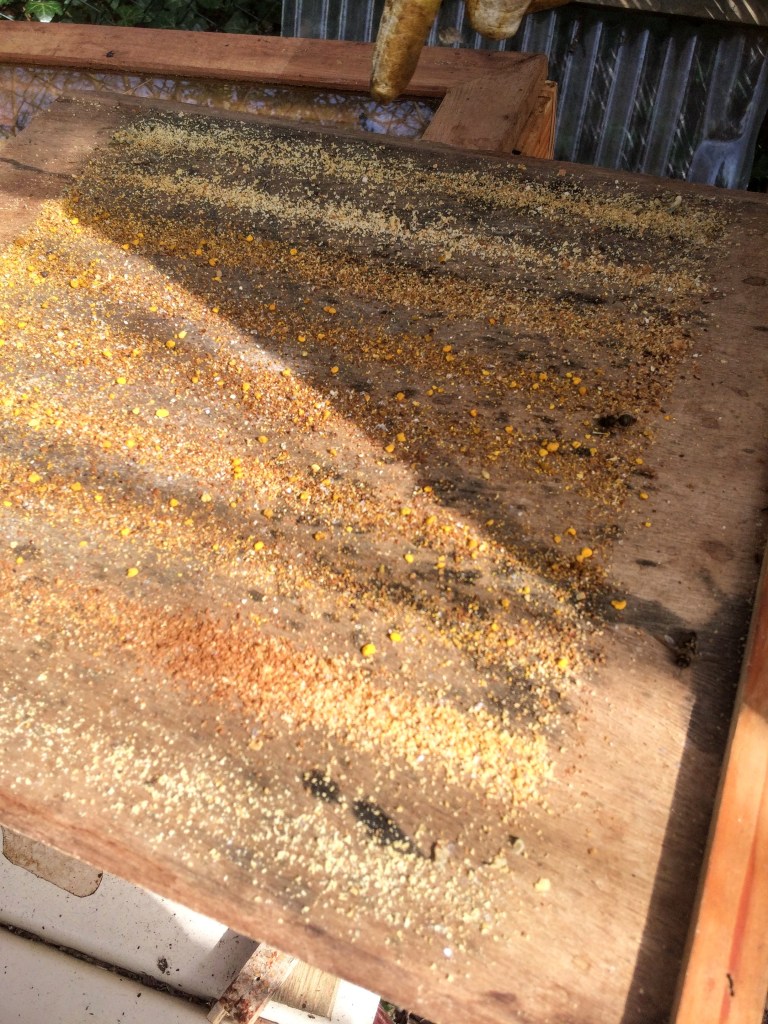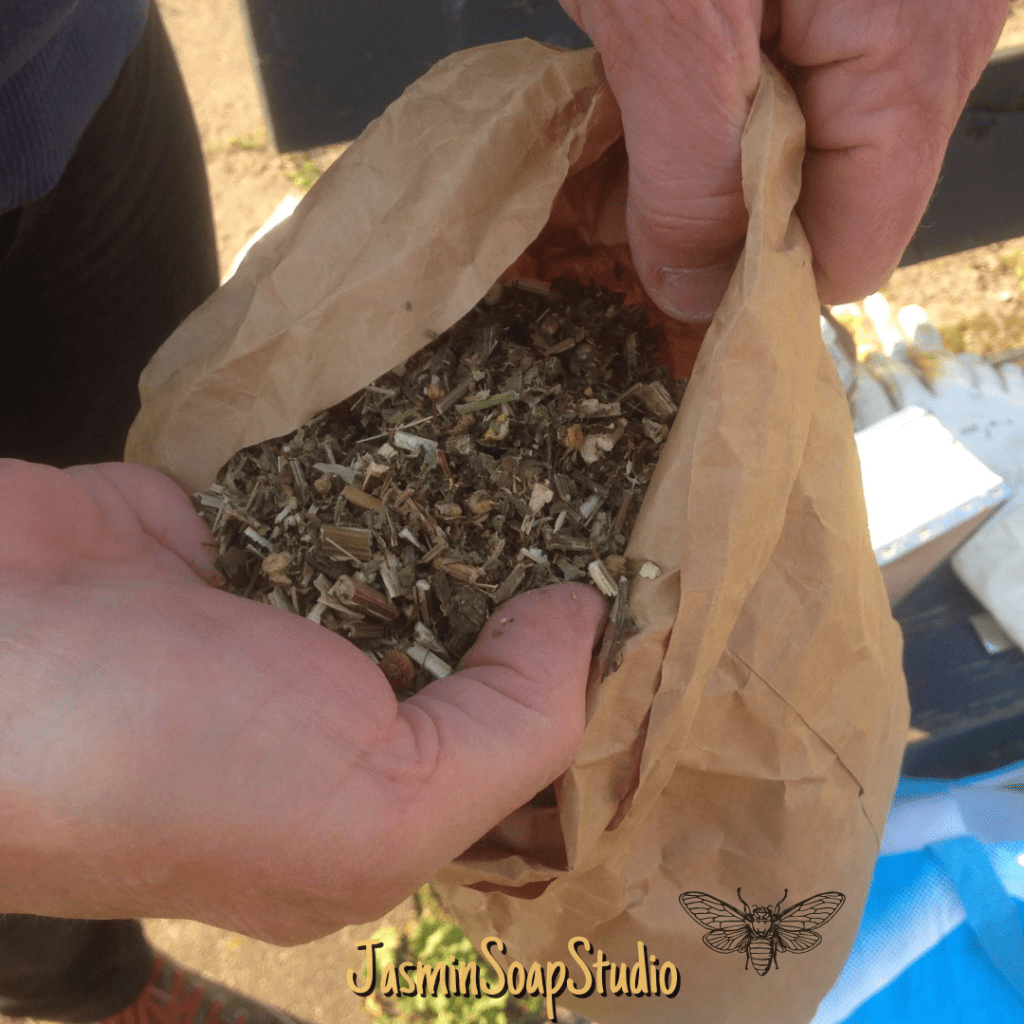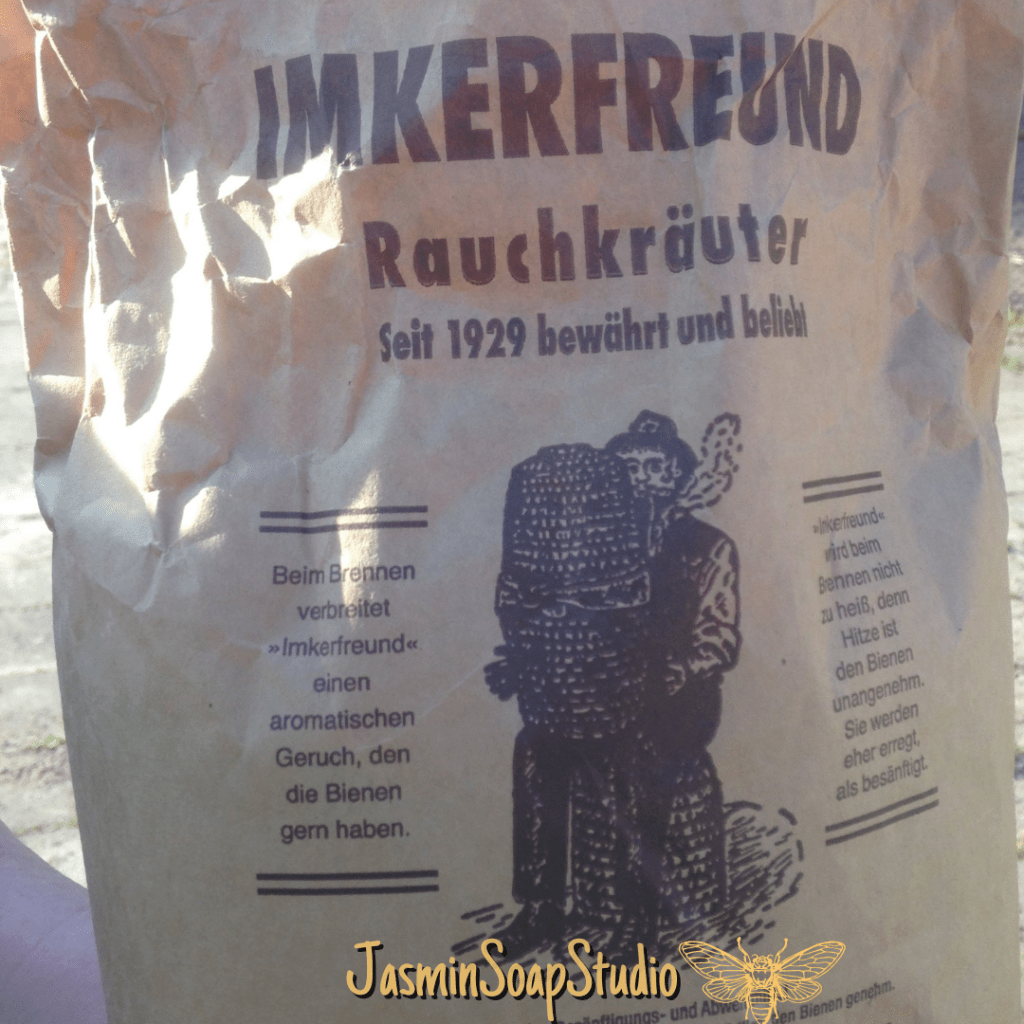 Een van de mooie dingen van het imkeren (om toe te kijken dan) vind ik het blaasbalgje waar de rook uitkomt. De bijen worden daar rustig van. Het kruidenmengsel in de balgberoker heet Imkerfreund. Er zit boerenwormkruid, duizendblad, hennep en citroenmelisse in. Overigens, de hennep bevat geen THC – de imker loopt dus niet met een mega grote joint te blazen.
