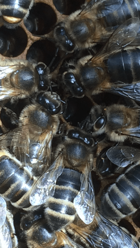 Met mijn lekenoogje vond ik de bijen er glanzend gezond en actief eruit zien.Gelukkig vond imker Yvon dat ook. Ze wees me ook de koningin aan. Een bijenkast kan maar één koningin bevatten. Als er een tweede geboren zou worden, dan vechten de dames het uit op leven en dood. Letterlijk.