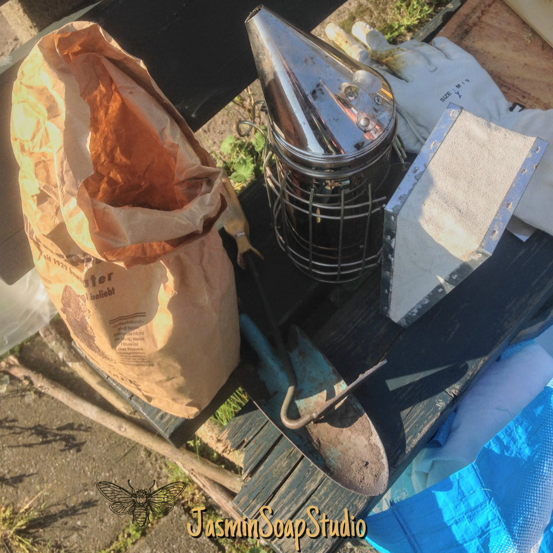Een van de mooie dingen van het imkeren (om toe te kijken dan) vind ik het blaasbalgje waar de rook uitkomt. De bijen worden daar rustig van. Het kruidenmengsel in de balgberoker heet Imkerfreund. Er zit boerenwormkruid, duizendblad, hennep en citroenmelisse in. Overigens, de hennep bevat geen THC – de imker loopt dus niet met een mega grote joint te blazen.